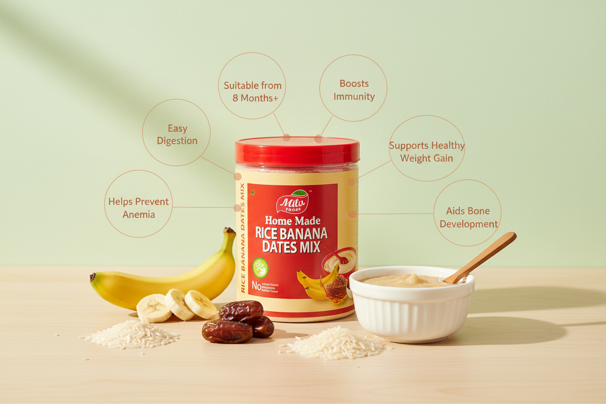 Rice Banana Dates Mix is s porridge that can be introduced to babies from eight month onward. Rather than using it as a first food, it is better to offer it as a "Second Stage" food. It is highly recommended to start this mix after the baby has been introduced to basic foods like raw banana powder(kannankaya powder) for one or two month.