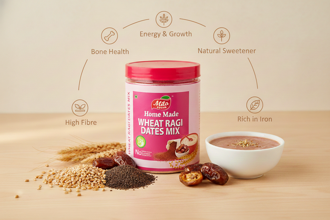 Wheat Ragi Dates mix is a nutrients-dense,energy- boosting health mix commonly used as a trasition food for babies (typically 8+month).It combines the strength -building properties of whole wheat and ragi with the natural sweetness and Iron of Dates