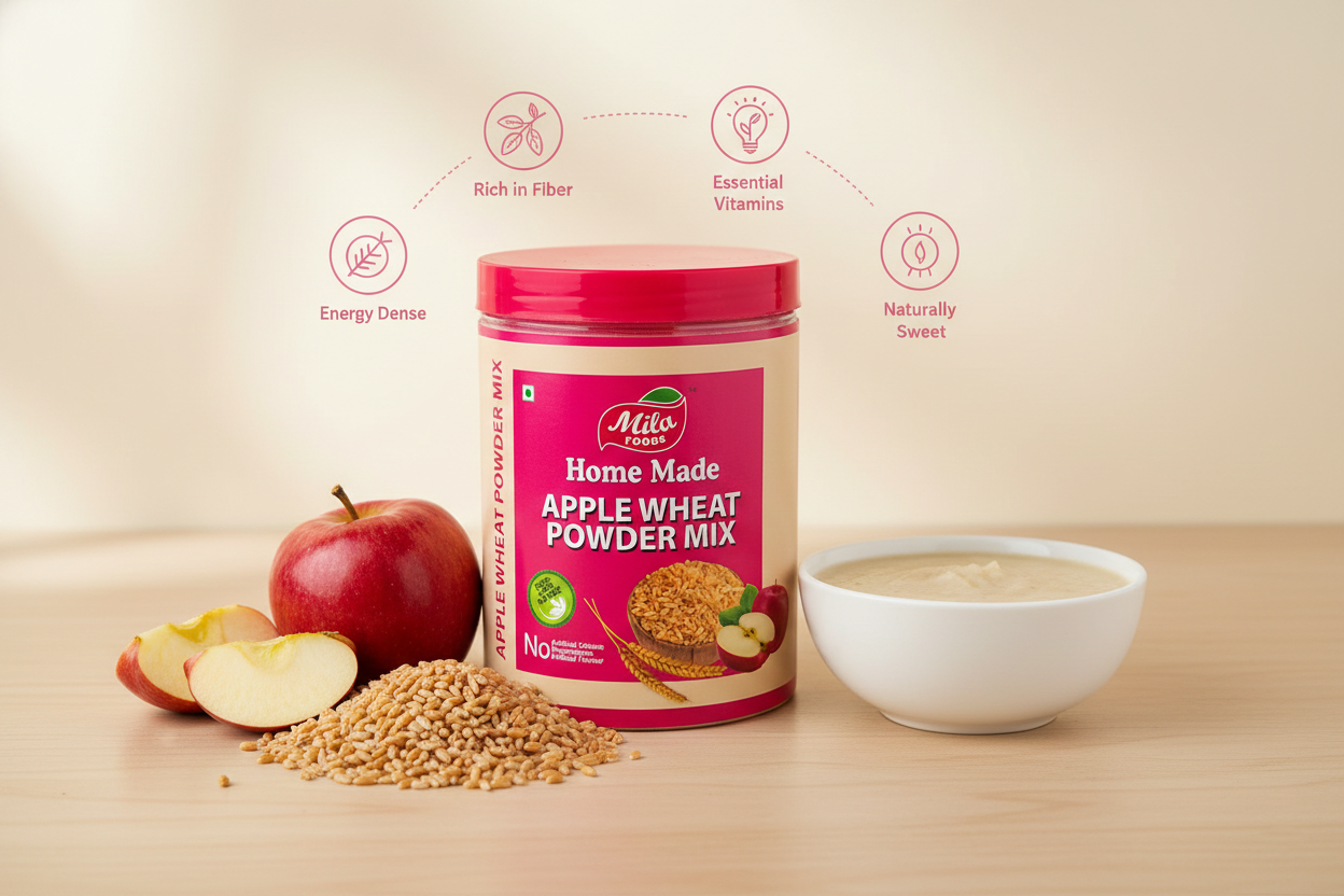 Apple Wheat Mix is a wholesome, Delicious and easy- to- digest cereal blend designed for babies(usually 8 month and older) It combines the fiber and energy of whole wheat with the gentle sweetness and vitamins of apple.